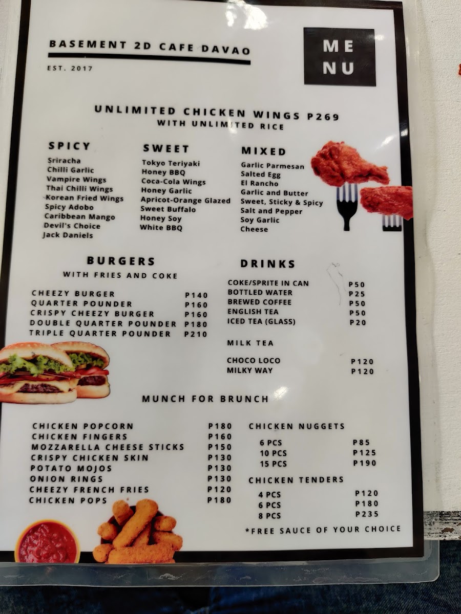 At Basement Cafe & Bar, located in the heart of Davao City, diners are greeted with a diverse and tantalizing menu. The café is renowned for its hearty burgers, such as the Extra Cheezy Burger, featuring a cheezy patty and crispy fries for just ₱180.00. For wing lovers, the famous flavored chicken wings come in various sizes and 25 irresistible sauces, perfect for those who enjoy interactive dining experiences. Try their unlimited wings and rice option at an unbeatable price of ₱269!